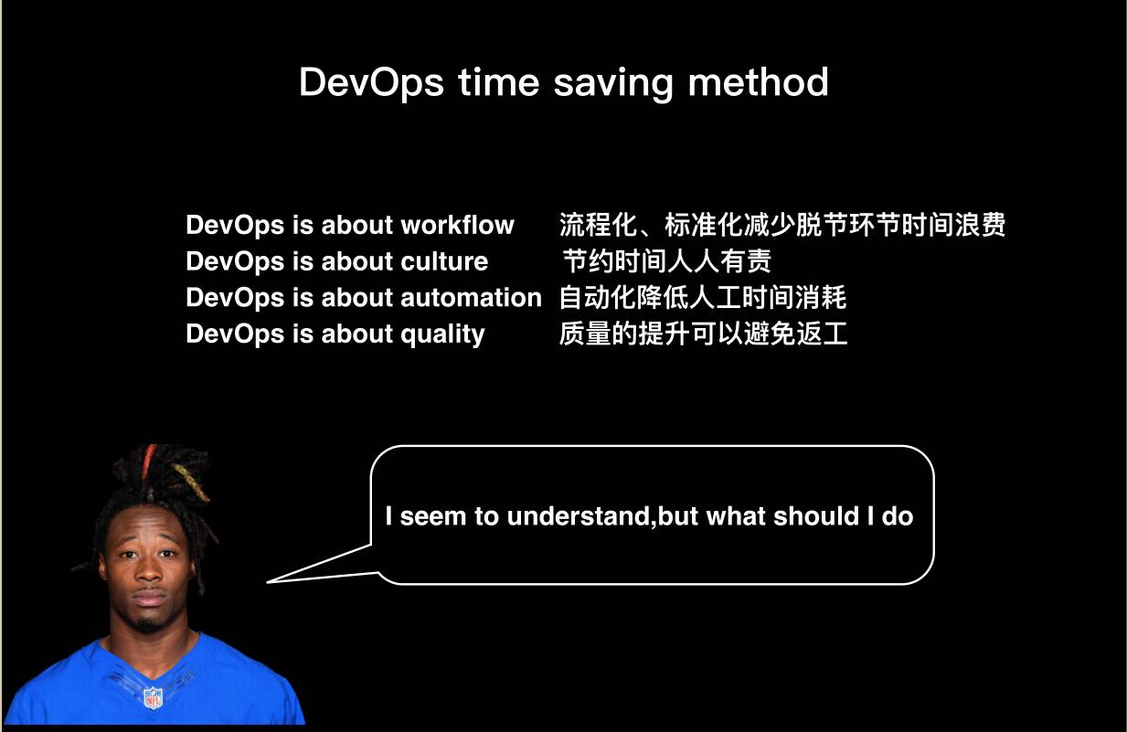 你可以想一下,大家引入 DevOps 要解决的根本的点:我要自动化一些流程,我要能快速的完成发布,我要提高质量,这些实际上根本都是一个时间问题, DevOps 其实就是来帮你节省你的时间。有人会说我提高代码质量和节省时间有什么关系,提高了代码质量就省去了返工的时间。