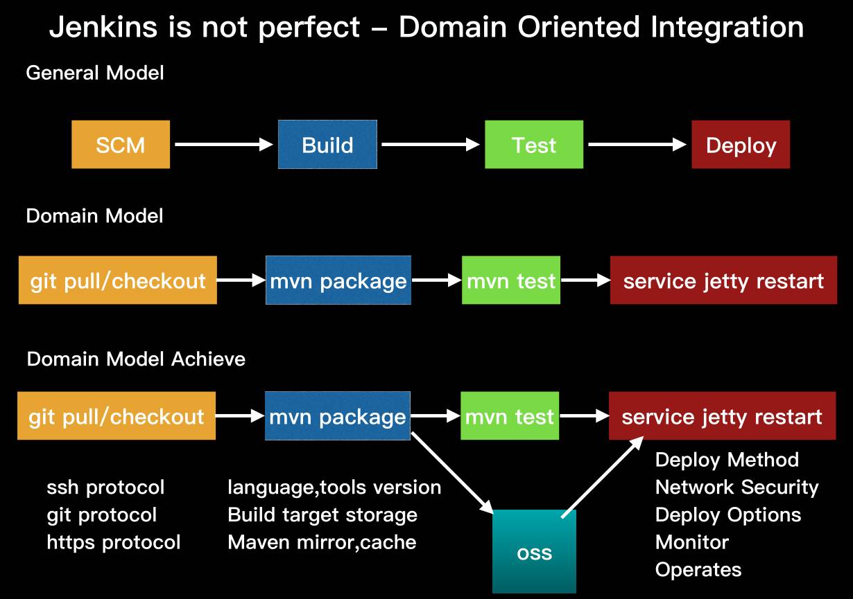 第三个是领域模型实现,比如原来的时候, checkout 这边需要有协议, package 需要有特定版本的,需要有一个构建完之后的中间产物放置的位置,可能会涉及到一些 mirror 、 cache 。这都是一些细节的东西,但是又和你最终使用 Jenkins 环境相关。比如在阿里云上你可能会把中间的构建产物放在私有的oss上;