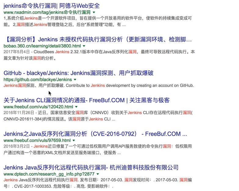 这几个是在谷歌里可以看到的常见的 Jenkins 的一些漏洞。比如第一是命令执行漏洞,这种是可以越权的;第二个是未授权代码;第三个是 Jenkins 漏洞探测、用户抓取爆破。