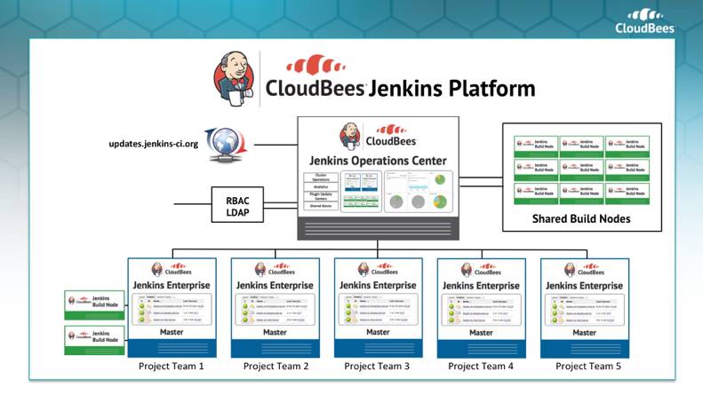 上图是 CloudBees 的方案,这个公司是 Jenkins 商业版支持比较完善的公司,这个是他们推出的 CloudBees Jenkins Platform 项目。有一个上层的概念,比如这两个是企业的两个部门,都是通过中间这个 operations Center 到自己的 Jenkins ,底下还是单独的 Jenkins Master 。