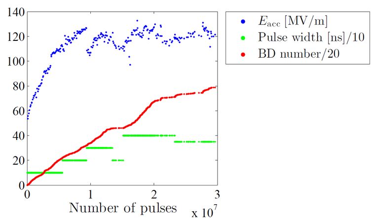 实验中最大加速梯度(蓝点)达到了130 MV/m