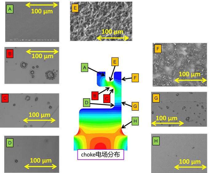 论文进而设计并制作Choke-mode加速结构,开展高梯度实验,对choke中的射频击穿现象进行了深入研究。提出利用场致发射电流信号作为choke中射频击穿事件的依据,并在表面形态观察中得到了验证。研究发现choke内过高的电场和较小的尺寸引发了严重的射频击穿,如下图所示,其中B、C所在的choke区域射频击穿点较多,限制了加速结构梯度的提升。通过降低choke区域的电场和扩大choke区域的尺寸,论文工作设计并研制出高梯度Choke-mode加速结构,实验中最大加速梯度可达130 MV/m。通过比较不同尺寸choke的高梯度实验结果,论文总结出评估Choke-mode加速结构高梯度性能的参量,为将来设计高梯度Choke-mode行波多腔加速结构打下了基础。