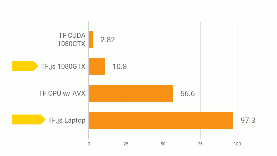 在 Node.js 中,TensorFlow.js 可以用 JavaScript 加载转换后模型,或使用 TensorFlow 的 C++ Binding ,分别接近和超越了 Python 的性能。