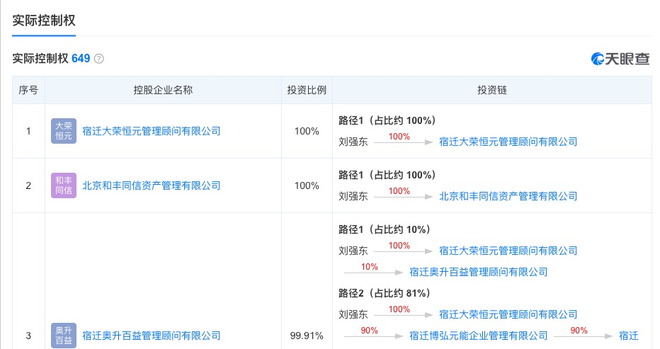 过去这一年多来,登上舆论头条的大多数是刘强东“卸任”的消息。据天眼查统计,截止到今年 5 月 14 日,刘强东在半年时间里卸任了 168 家公司的经理 / 总经理 / 董事长 / 法定代表人等职位。这一数字已十分惊人。天眼查显示,刘强东仍对 600 多家公司拥有实际控制权。
