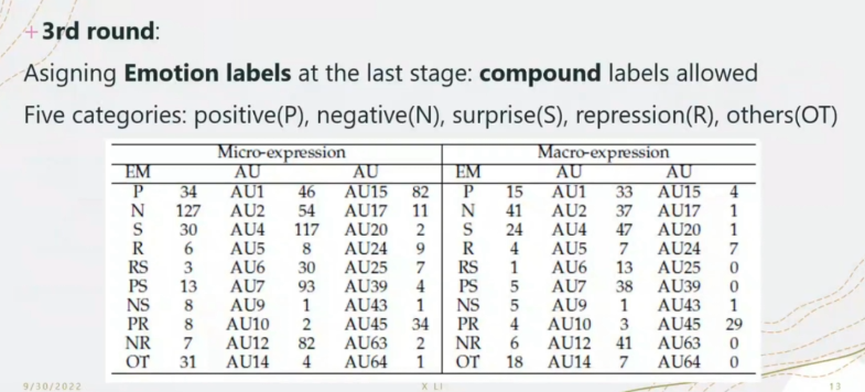 要性。李博士列出并深入讨论了与微表情注释相关的几个关键问题,特别是关于AU和微表情情感类别之间的关系。李博士提出了一个初步的AU-Emo映射表,并给出了合理的解释和支持性的实验结果。