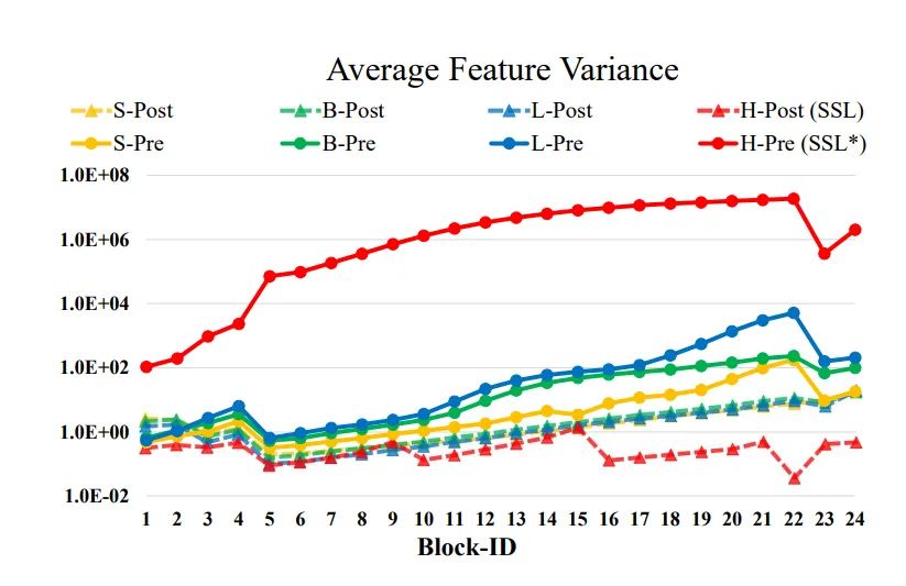 在进一步扩大模型容量的过程中,微软亚洲研究院的研究员们发现训练过程存在严重的不稳定性问题。如图2所示,随着原始 Swin Transformer 模型从小变大,网络深层的激活值会急剧增加,拥有2亿参数的 Swin-L 模型,其幅值最高和最低层之间的差异可以达到10^4。当进一步将模型容量扩大到6.58亿参数,它会在训练过程中崩溃。