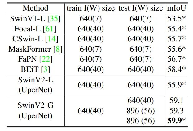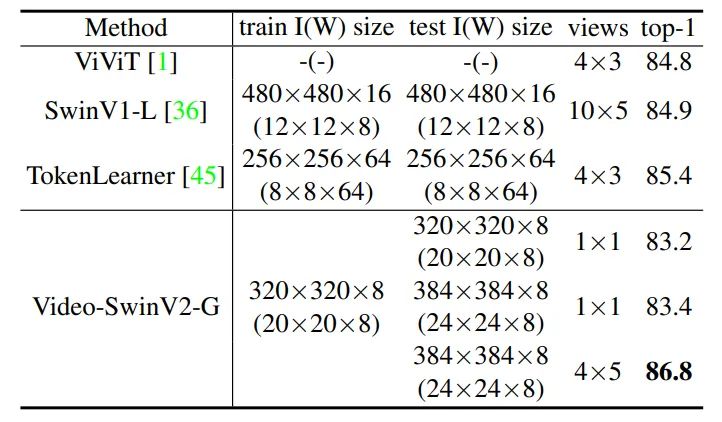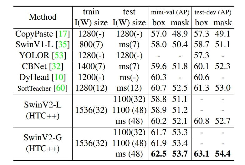 通过扩展模型容量和分辨率,Swin Transformer v2.0 在四个具有代表性的基准上均刷新了纪录,证明了视觉大模型在广泛视觉任务中的优势:在 ImageNet-V2 图像分类任务上 top-1 准确率为84.0%;在 COCO 物体检测任务上为63.1/54.4 box/mask mAP;在 ADE20K 语义分割上为59.9 mIoU;在 Kinetics-400 视频动作分类的 top-1 准确率为86.8%。