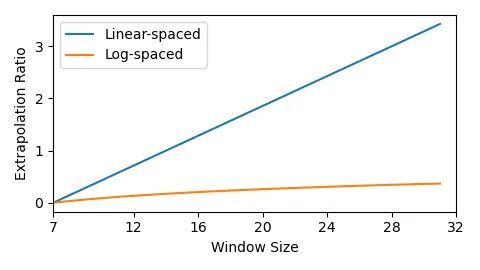 为了解决这一问题,研究员们提出了对数空间的连续位置偏置(Log-spaced continuous position bias, Log-spaced CPB)。通过对对数空间的位置坐标应用一个小的元网络,Log-spaced CPB 可以产生任意坐标范围的位置偏置。由于元网络可以接受任意坐标,因此通过共享其权重,一个预训练好的模型可以在不同的窗口大小之间自由迁移。另一方面,通过将坐标转化到对数空间,在不同的窗口分辨率之间迁移所需的外推率要比使用原始线性空间坐标的外推率小得多,如图4所示。