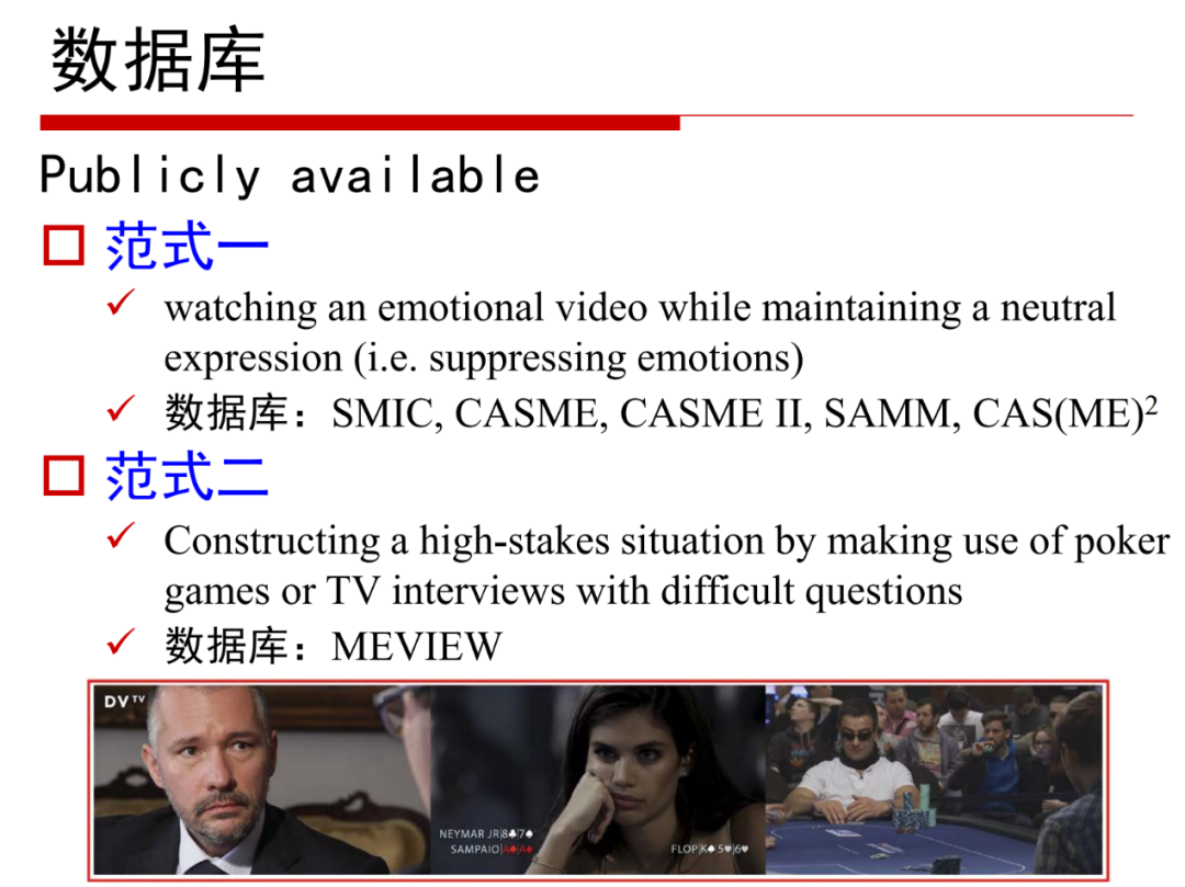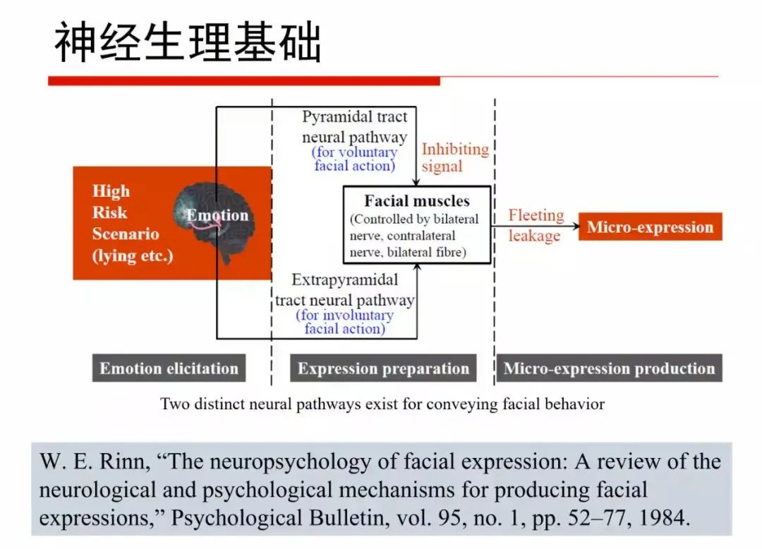 个体在控制面部肌肉做出表情的存在如下图所示的神经通路,包括一个自发的不受控制的通路和一个由个体主动去控制的通路。微表情的诱发需要一个高风险的场景,这个场景可以引发被试强烈的情绪反应,但是被试需要努力控制住表情,从而不流露出情绪。在这种高风险的场景下,两种通路在互相冲突,个体一方面会无意识地呈现出表情,另外一方面个体会控制自己不表现出相应表情。在这种特定的条件下,双方在博弈时,无意识表现占据上风的情况下,最后会泄露出来一些微弱的表情。这种微表情的表达方式对其后续的实际应用非常有价值。