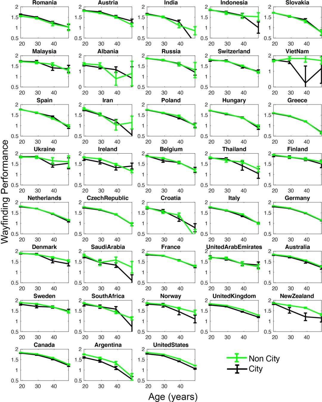 因此,研究人员假设来自城市的参与者在需要更短轨迹的游戏关卡中会有更好的找路表现。