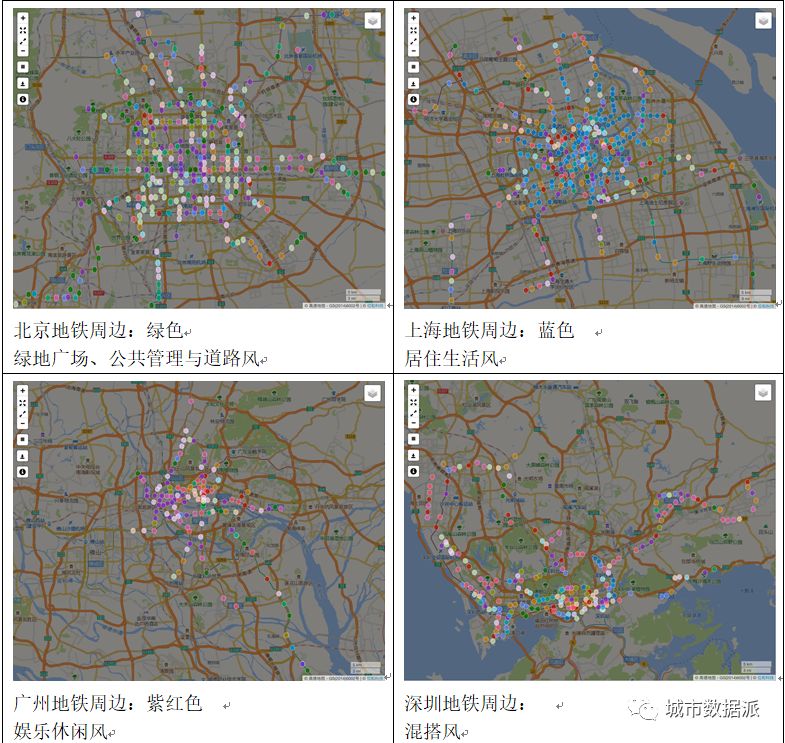 北京地铁站周边的画像是混合色调,其中绿色调在四个城市中最强。