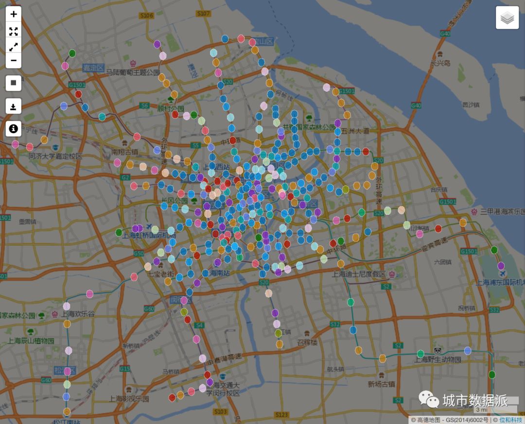 绿色分类的特点是居住功能密度最高。绿色的地铁圈大多在上海。