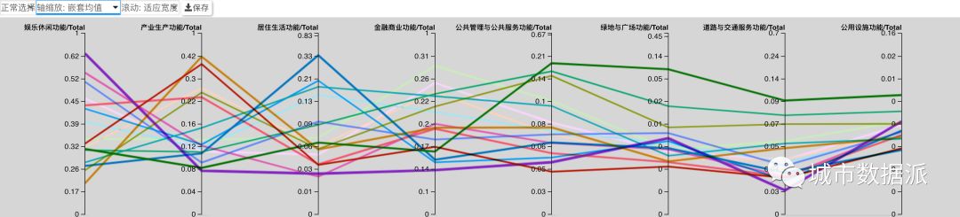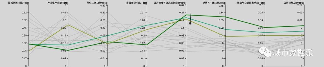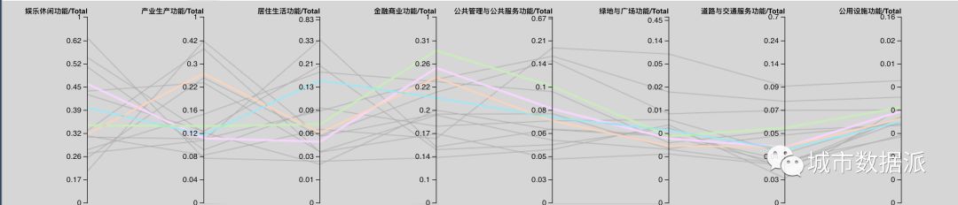 但这种排列方式不能很好地表达各个分类之间的差异。换成“嵌套均值”类型来排列,如下图所示,分类的差异变得明显了。并且观察到,右面4列的分类线之间很少交叉,说明北上广深地铁站周边的公共管理与公共服务功能、公共设施功能、绿地与广场功能、道路与交通服务功能的占比是正相关的。