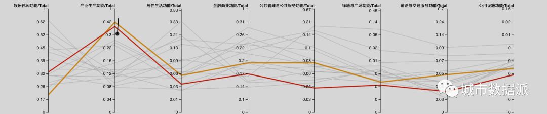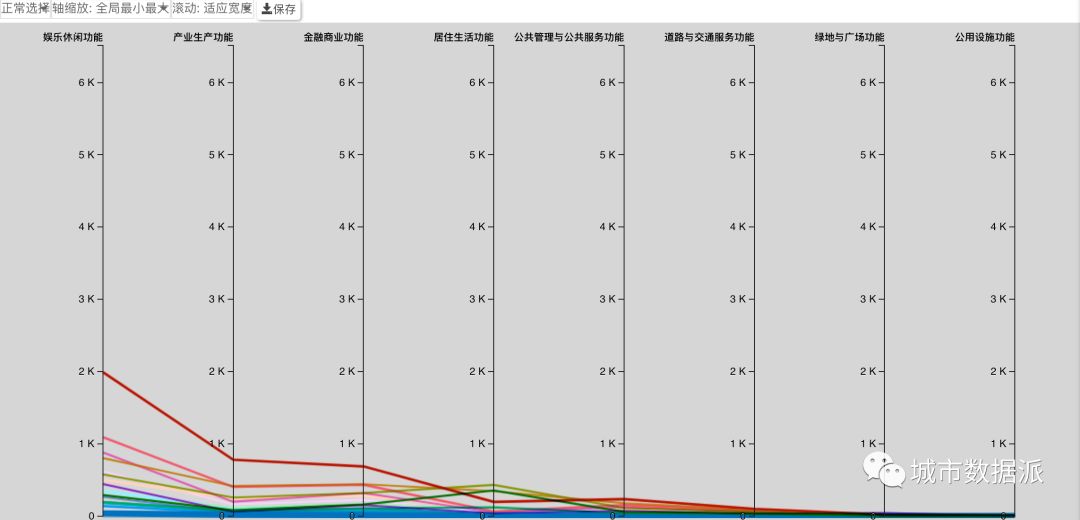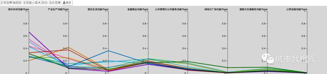 当把各个指标在纵轴的排列类型设为“全局最大最小”时,可以很明显地观察到地铁周边城市功能按占比从高到低排列的顺序为:娱乐休闲功能、产业生产功能、居住生活功能、金融商业功能、公共管理与公共服务功能、绿地与广场功能、道路与交通设施功能、公用设施功能。
