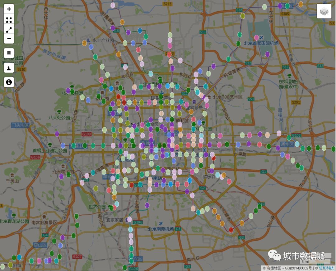 关内和关外,无论从地铁站的密度还是地铁圈的功能特征(颜色)来看,差异都很明显;