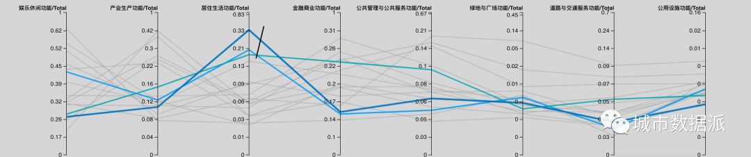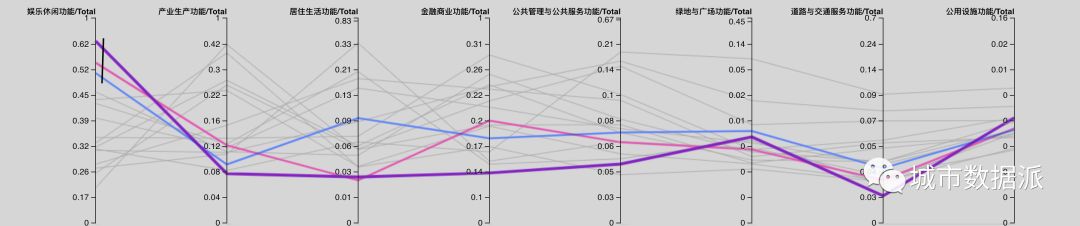 大家常见的地图图例是单因子图例。多因子图例比单因子图例复杂。图中的每条线代表多个城市功能指标组合的类型;每个纵轴代表一个城市功能指标。