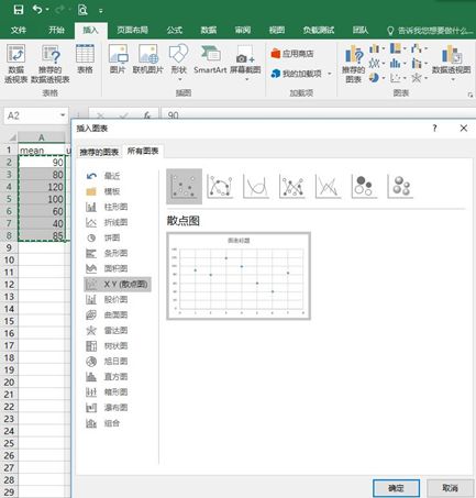 (2)选择数据,然后在菜单栏插入——所有图表——散点图,点击确定
