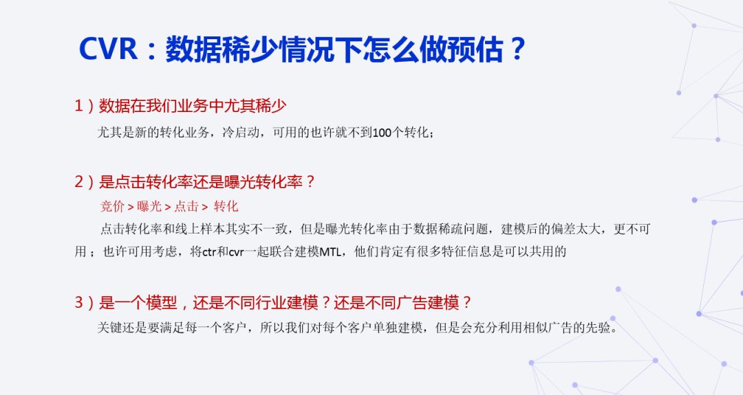 关于 CVR 数据稀疏的问题。新的客户在冷启动阶段的转化不到100个,使用不到100个的转化建立用户的转化率的预估,这个问题是比较困难的。其次,点击转化率与曝光转化率其实不一致,这是一个漏斗序列,先曝光再点击再转化。