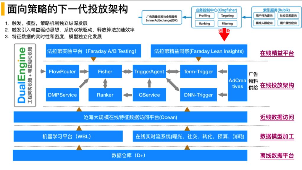 系统架构总体上分为:在线精益工具平台、在线投放系统、近线数据访问、数据模型加工(曝光机器学习平台和在线实时流的机制)和离线数据平台