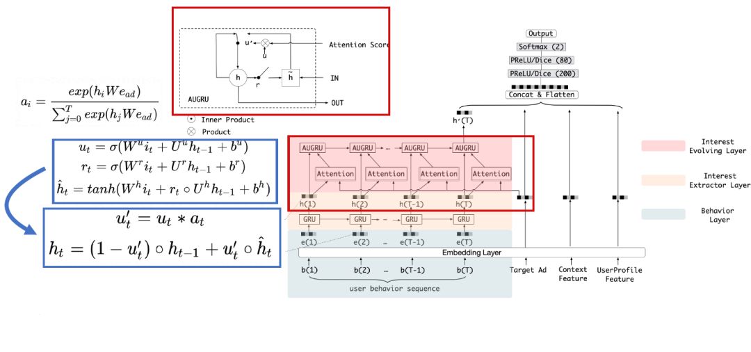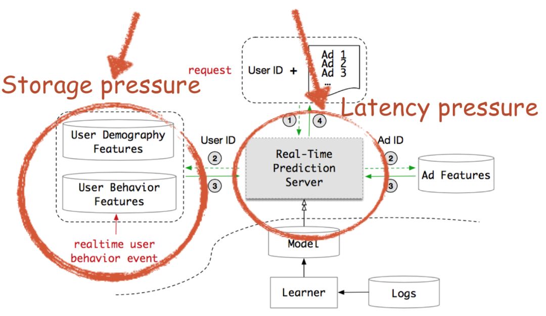 上图展示的是在线 RTP 引擎,当一个 request 过来的时候,会打分大概400个广告,我们根据 Ad ID 去 Ad Feature 这个索引库里面提取广告特征,根据 User ID 去提取 User 的 Demography 特征以及行为序列特征,然后送入模型进行打分,排序后将广告返回给用户。点击率预估与大部分工业应用一样需要一个实时的响应。在阿里这个电商平台里,点击率预估系统不仅面临高并发的请求,还需要在一个极短的时间内进行响应。我们的 DIN 和 DIEN 模型由于原始序列和 Target 均有显式交互,因而无法解耦计算,当行为序列长度为100时,DIN 和 DIEN 现有的复杂度逼近计算极限,由于计算资源的约束,在现有的模型下想把行为序列往1000扩展是不可能的。另外一方面,用户的行为特征是存储在线上服务引擎,阿里有亿级的用户,如果每个用户存储的行为序列特征由100扩展到1000,将带来极大的存储消耗和模型服务 IO 问题。因此我们面临着延迟约束和存储限制的系统瓶颈。