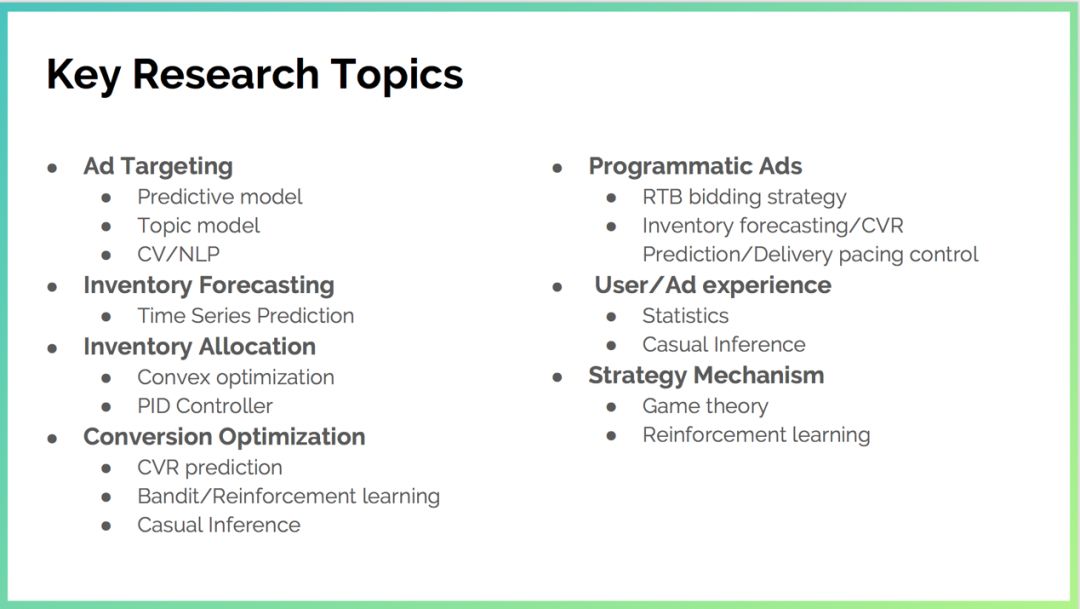 上图总结了在 Hulu 的视频广告系统中的核心算法问题,也是我们研究员每天在做的事情: