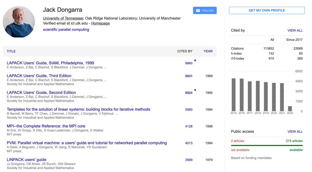 Dongarra 在上述工作中与许多国际学者进行合作,通过不断开发新技术以最大限度地提高性能和便携性,同时使用最先进的技术保持数值可靠的结果,始终扮演了创新驱动力的角色。
