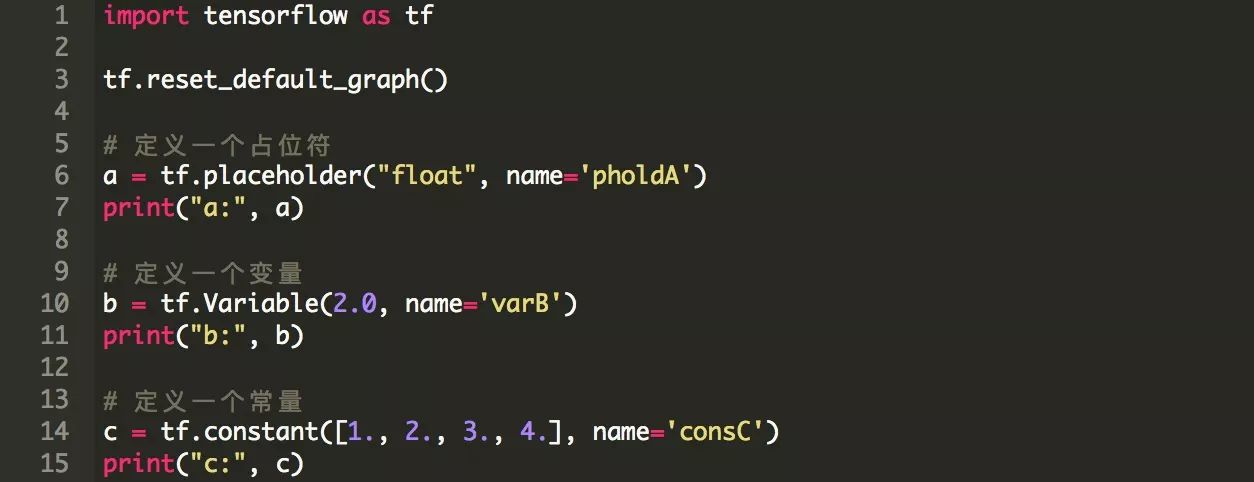 张量是TensorFlow中的基本数据结构,它存储任意维数的数据,类似于NumPy中的多维数组。 张量有三种基本类型:常量,变量和占位符。