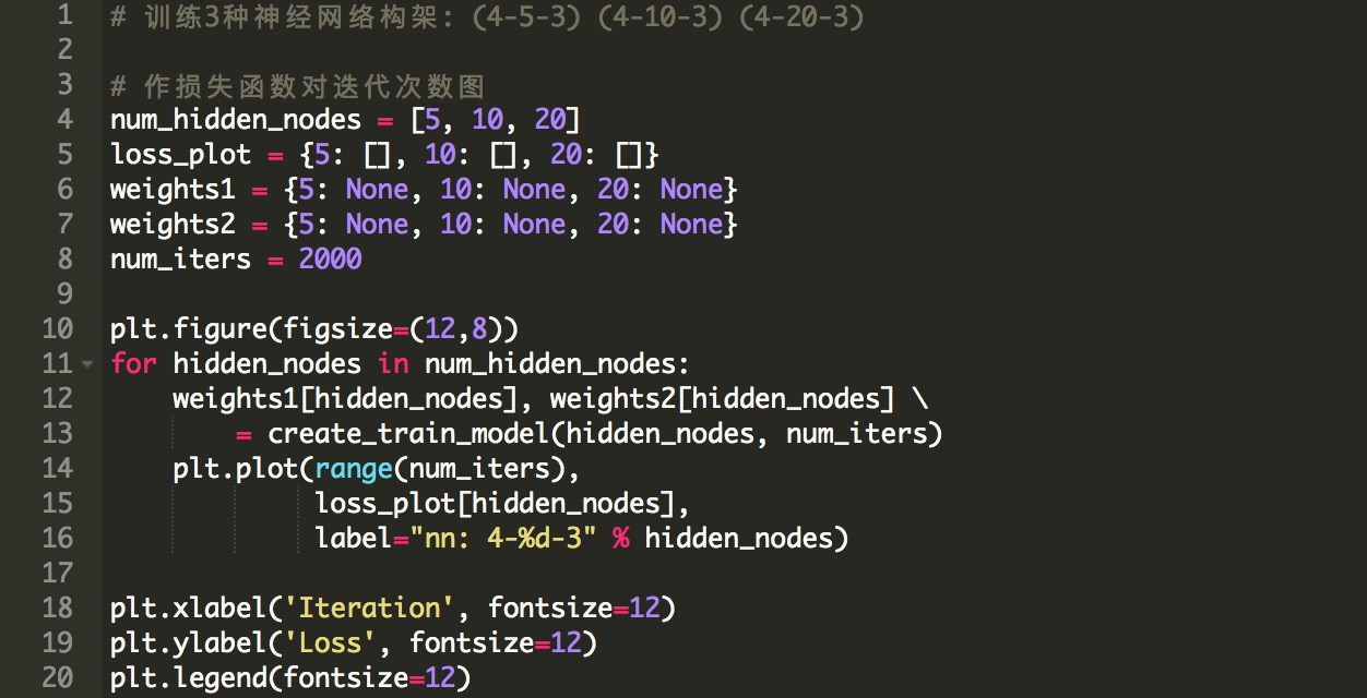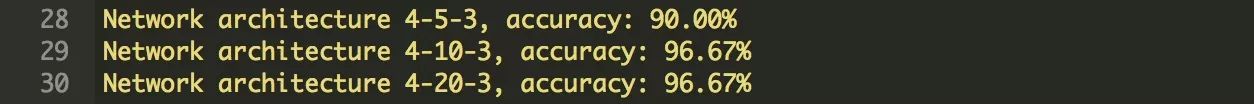 我们为隐藏层中的神经元数目选择三个值:5,10和20,得到(4-5-3),(4-10-3)和(4-20-3)的网络大小。 这意味着,例如(4-5-3)将有4个输入神经元,5个“隐藏”神经元和3个输出神经元。