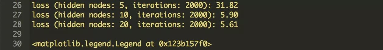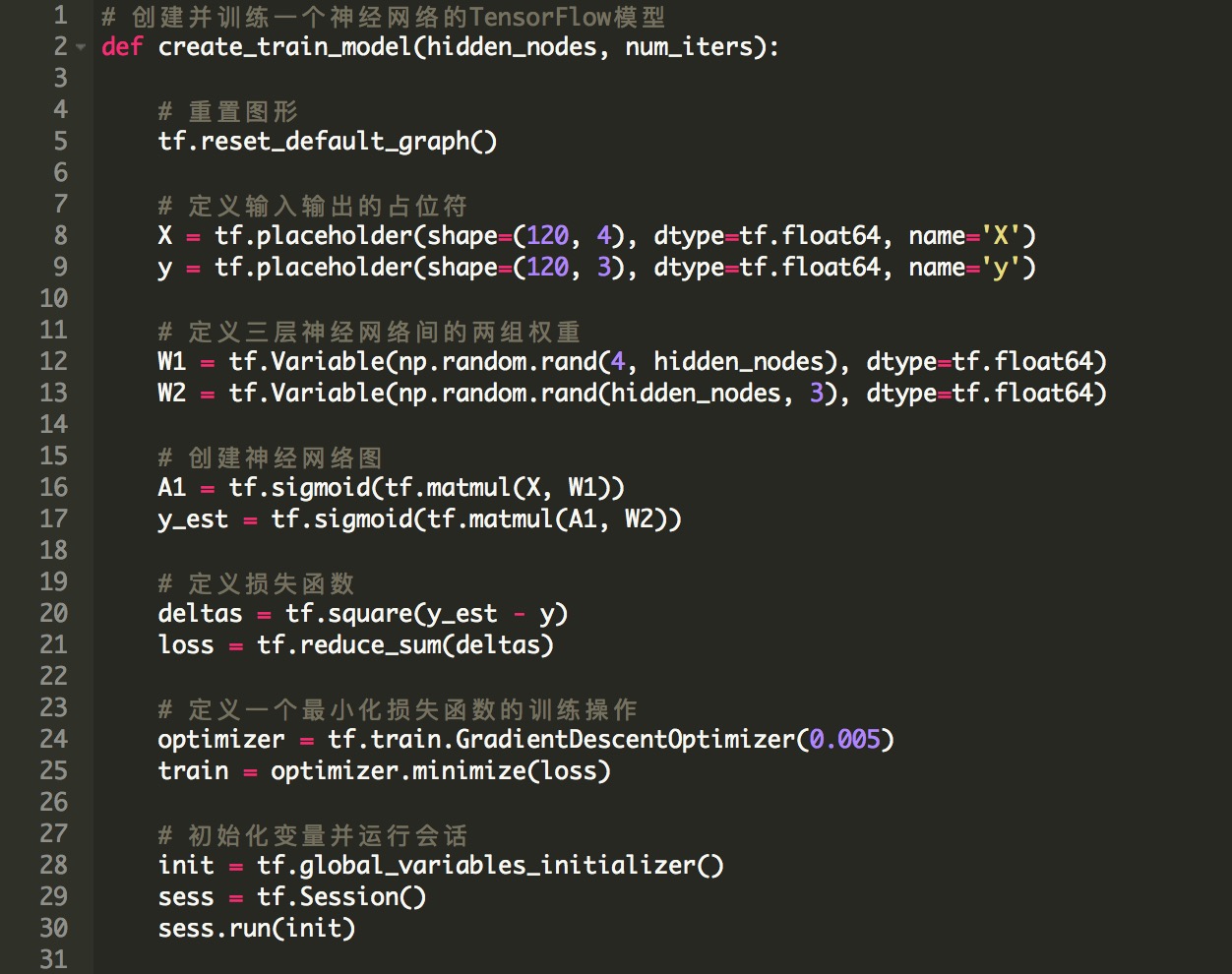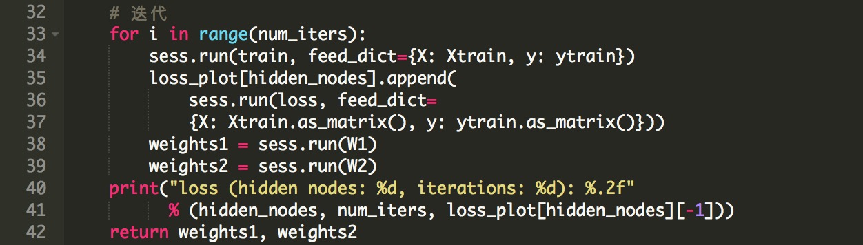 下面的代码定义了一个函数,我们在这个函数中创建模型,定义一个需要最小化的损失函数,并且运行2000次迭代,来训练习得最优权重W_1和W_2。 如前所述,输入和输出矩阵被馈送到tf.placeholder张量,并且权重被表示为变量,因为它们的值在每次迭代中变化。损失函数被定义为我们预测y_est和实际物种类型y之间的平均方差,我们使用的激活函数是sigmoid。最后,由create_train_model函数返回学习权重并输出损失函数的最终值。