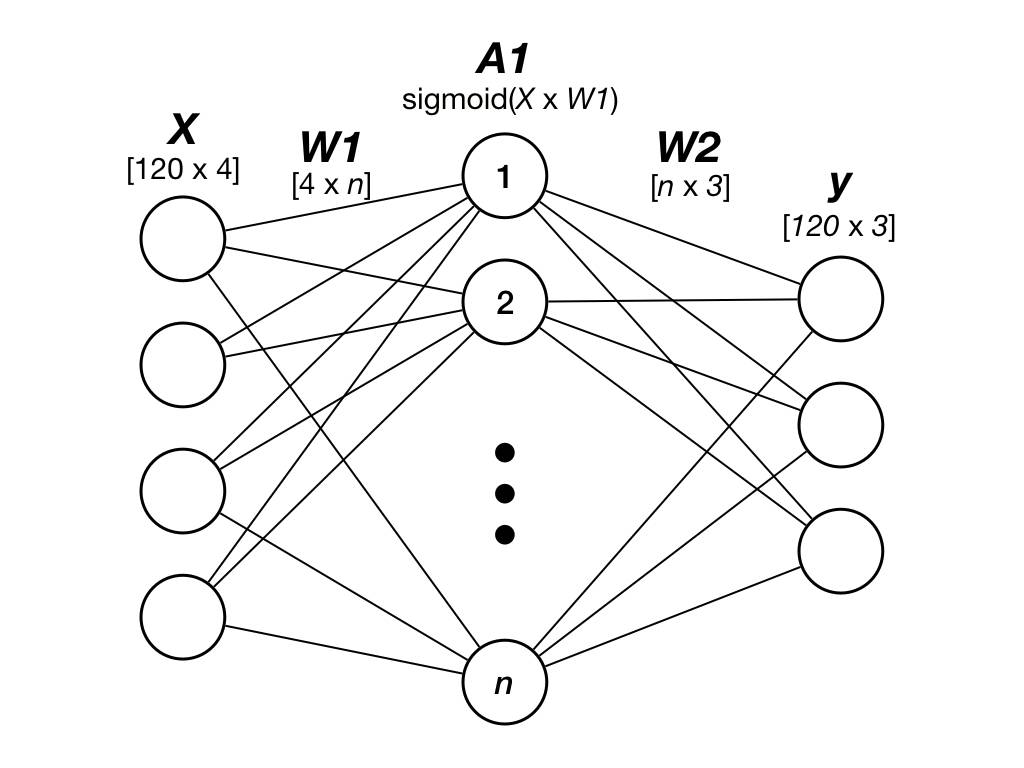 我们的神经网络的输入和输出层的形状将对应于数据的形状,即输入层将包含代表四个输入特征的四个神经元,而输出层将包含三个神经元,每一个神经元存储1比特,3比特以独热的方式可以存储植物的三种类型。例如“setosa”物种可以用矢量[1,0,0]编码,“virginica”用[0,1,0]编码。