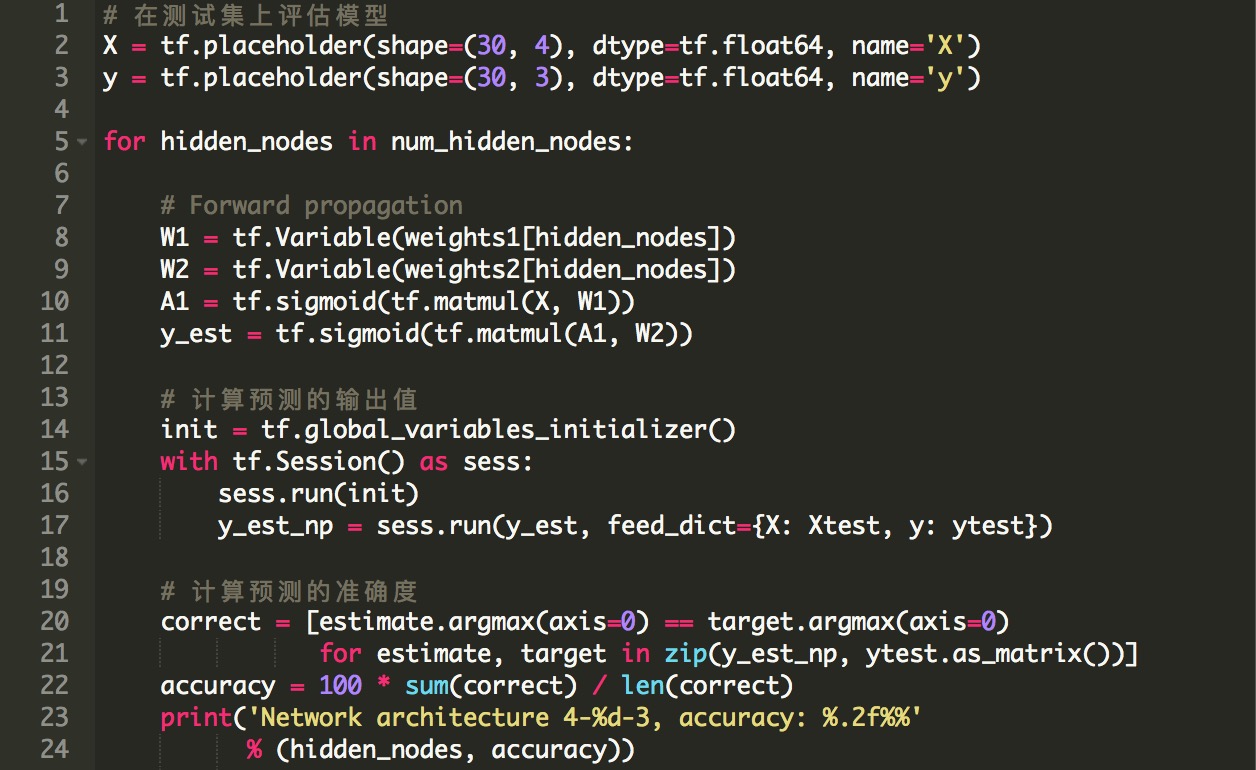 最后,让我们来评估我们的模型。我们使用学习权重W_1和W_2,将模型应用于测试集的类型的预测。准确性定义为正确预测样本的百分比。