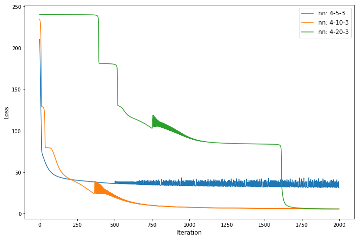 好,让我们创建(之前提到的)三个神经网络架构,并在迭代中绘制损失函数。