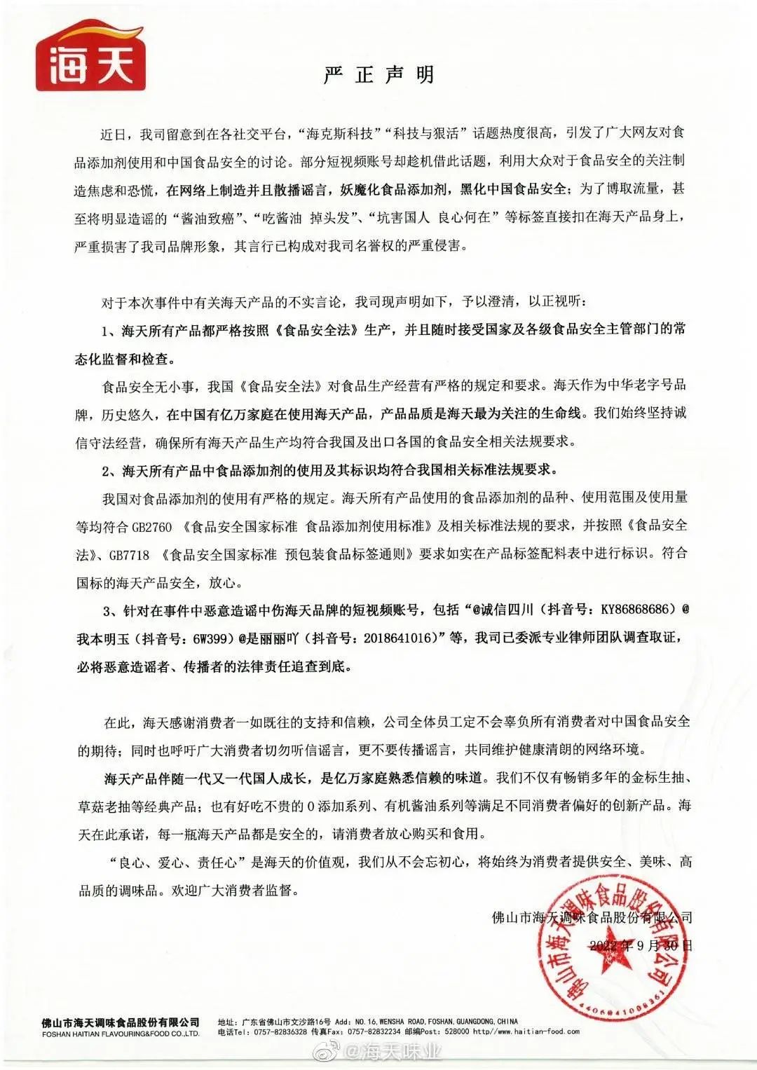 9月30日,海天发布声明,称部分短视频账号利用大众对于食品安全的关注制造焦虑和恐慌,妖魔化食品添加剂,黑化中国食品安全;为了博取流量,甚至将明显造谣的“酱油致癌”“吃酱油掉头发”“坑害国人良心何在”等标签直接扣在海天产品身上。