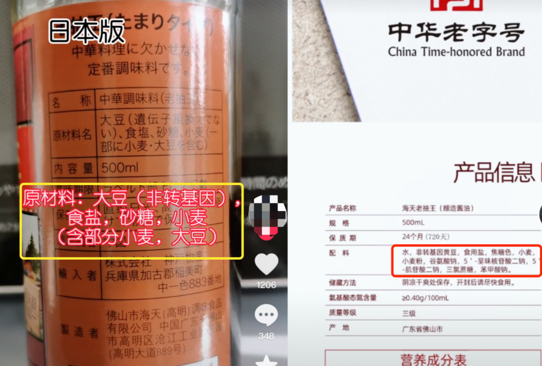 事情并没有结束。从9月末到10月4日,多位网友在短视频平台晒出在国内市场和国外市场,购买的海天酱油“配料表”对比,流传较广的是在日本购买的海天酱油,配料表中只有大豆、小麦、食盐、砂糖等原料,而在国内购买的海天酱油,除上述原料外,还有多种添加剂,从而引发了大众对海天酱油“双标”的质疑。