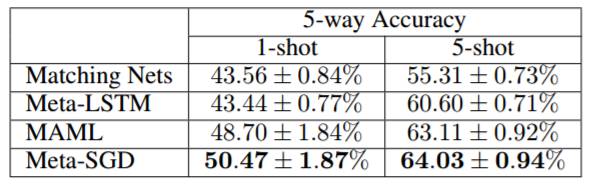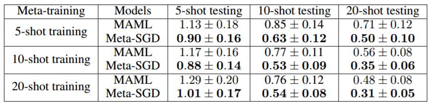 表 1:Meta-SGD 与 MAML 在 few-shot 回归方面的对比情况。