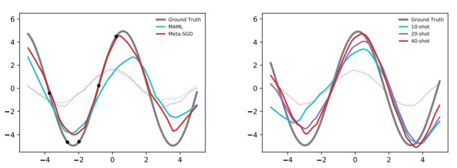 图 3:左:在一个随机 5-shot 回归任务中 Meta-SGD 与 MAML 的对比情况,两种情况下的初始化(虚线)和单步调适(adaption)后的结果(实线)如该图所示。右:在训练样本更多的情况下,Meta-SGD(10-shot 元训练)在元测试中表现地更好。