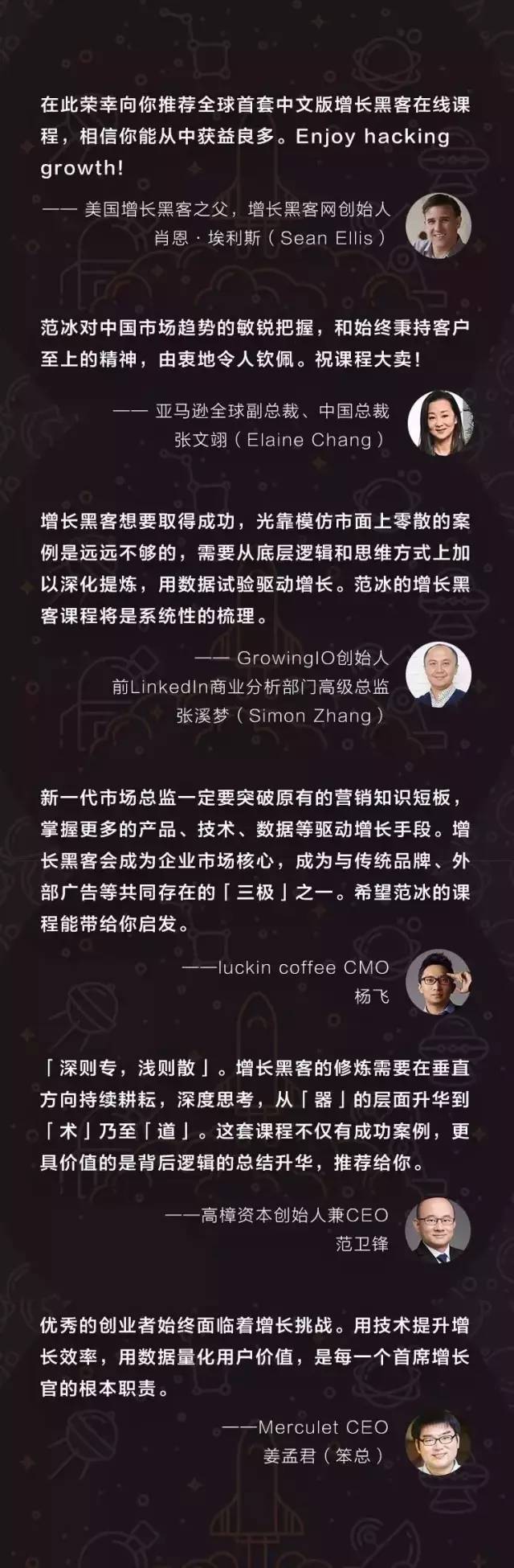 这堂课程已经得到了包括硅谷“增长黑客之父”Sean.Ellis,亚马逊全球副总裁张文翊在内的诸多业内顶级大咖的背书推荐: