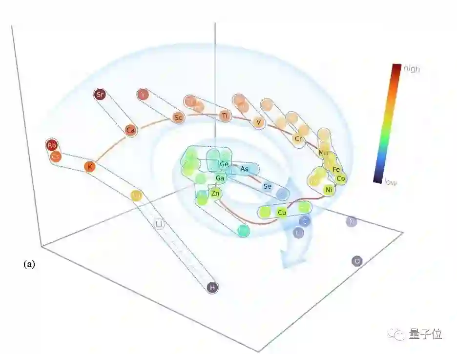可以看到,所有元素都呈螺旋状分布,同周期元素沿着螺旋下降,同族元素则垂直螺旋方,恰好对应的是元素周期表的位置。