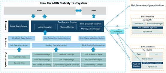 稳定性测试架构分为四层:组件层主要包含测试Blink job,monkeys和dumper;action层包含job启动,状态校验,输出校验等;执行层包含service,monkey操作等,monkey操作时会根据ssh到具体机器,执行monkey操作;最上层是WebUI。详情如下图所示: