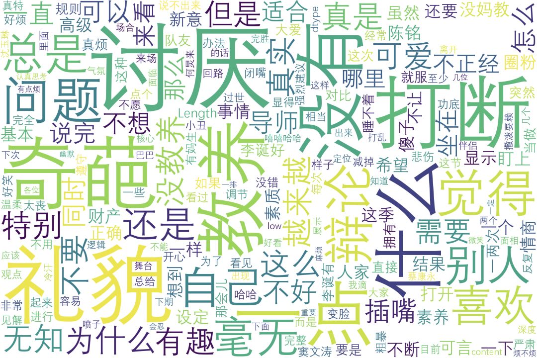 从上面的关键词中可以看出,观众对于李诞的情感词云偏于负面,譬如“讨厌”、“教养”、“礼貌”、“打断”等。