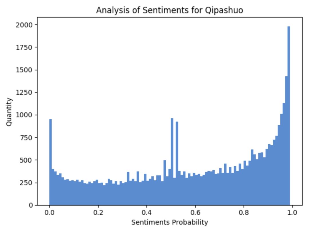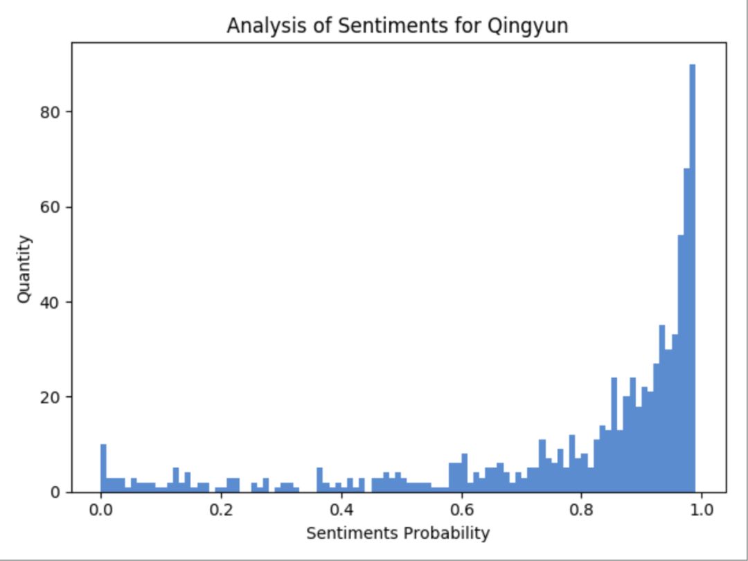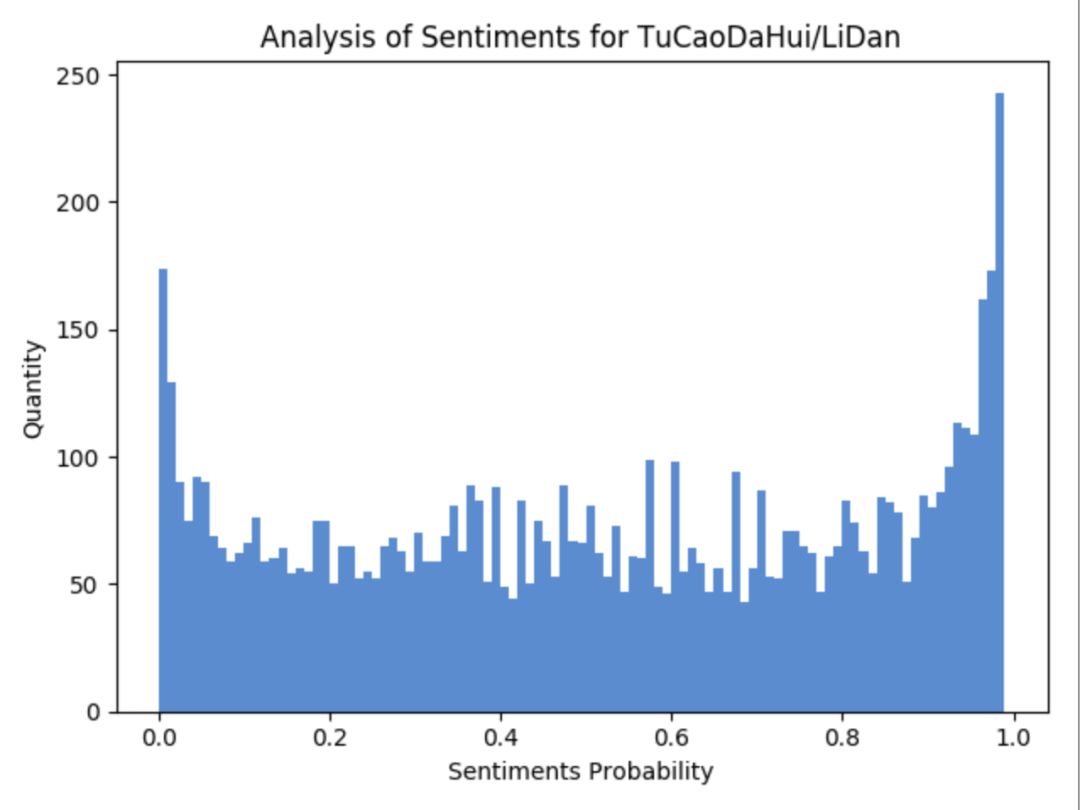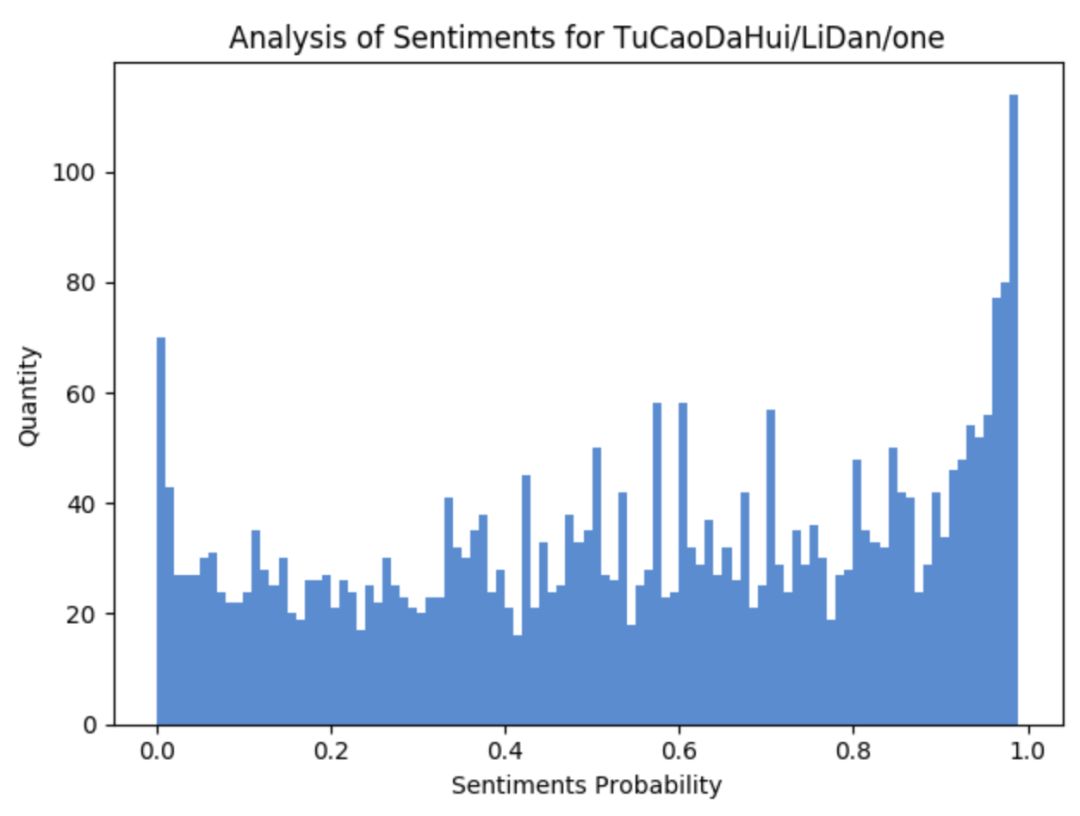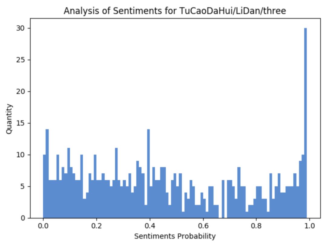 好多人都说李诞是在被人骂,所以笔者在此对评论中包含李诞的数据进行了过滤(作者注:这样来看不一定准确,但也能从一个角度来看大体的数据情况),做了一下情感分析,先看图: