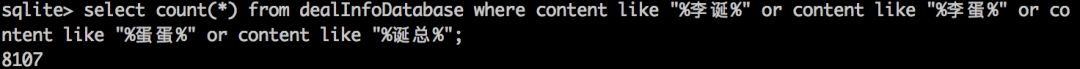 select count(*) from dealInfoDatabase where content like "%李诞%" or content like "%李蛋%" or content like "%蛋蛋%" or content like "%诞总%";