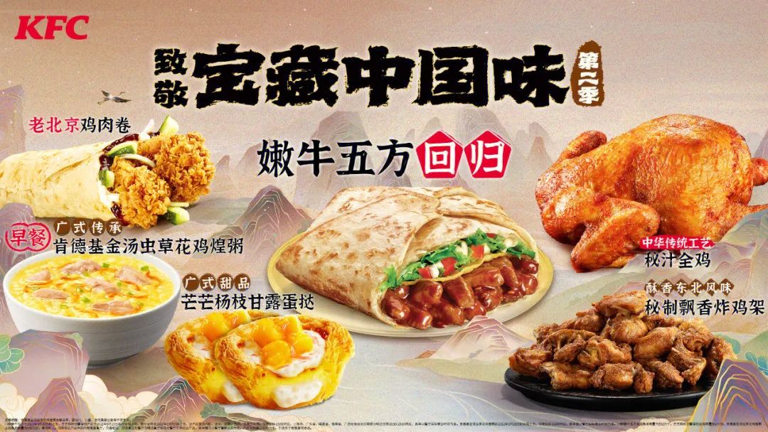 你以为这就结束了?No,no,no!KFC“宝藏中国味”第二季也来啦,嫩牛五方+秘汁全鸡+老北京鸡肉卷+杨枝甘露蛋挞,我已经开始怪自己为什么只有一个胃了。