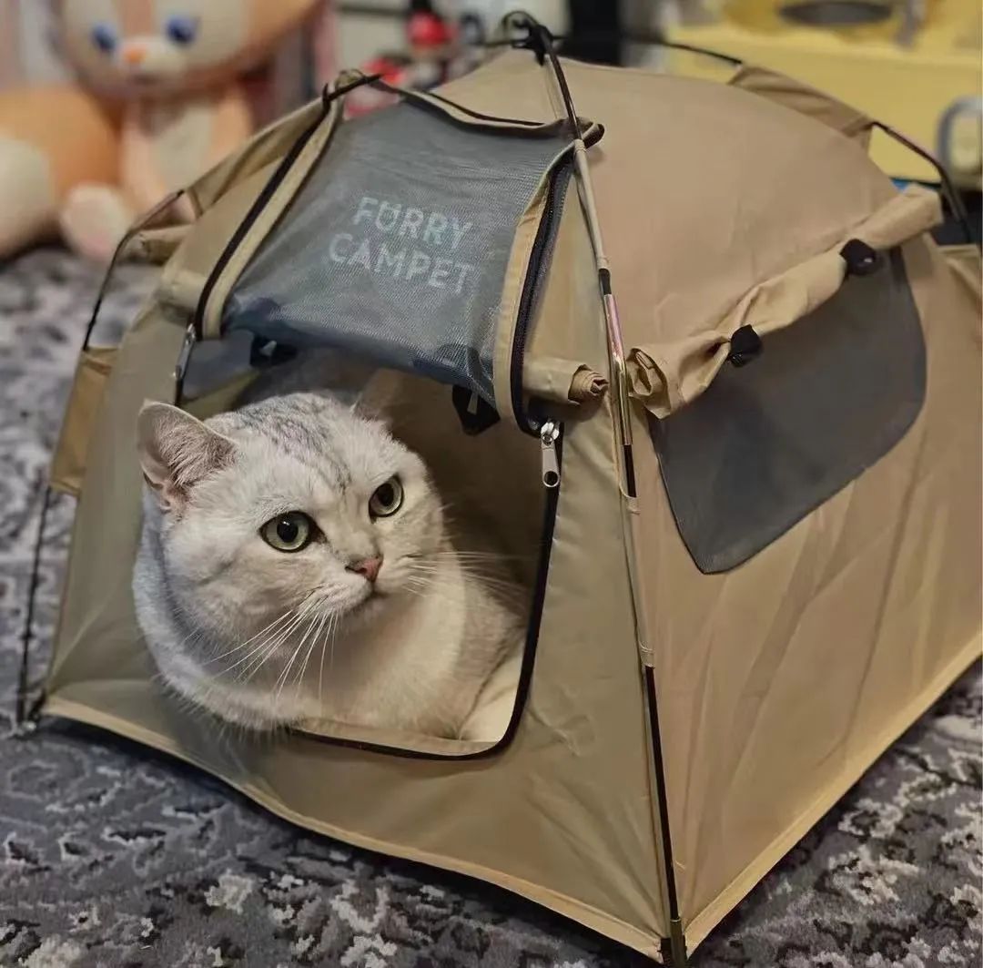 又是猫猫过得比人好系列。需要注意的是,猫猫的露营帐篷需要根据喵的体型进行选购哦,而且一开始也不要把喵硬塞进去!放几块冻干喵可能自己就进去啦,熟悉环境后喵会很爱这个小窝!