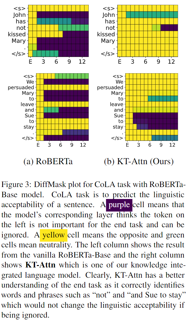 其中,黄色代表重要,紫色代表不重要。可以看到,知识增强之后,第一句 has 和 kissed 最终的重要度显著提升,我们也知道,这两个词对语法正确的判定尤为重要,第二句中 Sue to stay 最终被视作不重要,也符合我们对英文语法的认知。