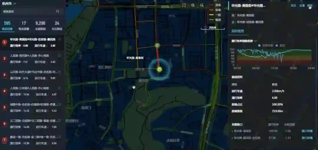 城市就像人体,交通流量如同血液,如果人生病了,医生会为患者做全面检查获得各项健康指标,根据指标值定位病灶、药到病除。杭州城市大脑对遍布全城的交通传感器、视频感知参数、公交车出租车、互联网导航数据进行多源融合,构成围绕交通量、拥堵指数、主干道速度、快速路速度、安全指数的五大“生命体征指标体系”,不同类别数据间取长补短、交叉验证,帮助交管部门摆脱“雾里看花”、“盲人摸象”的困境,交通管理部门在详实可靠的实时数据基础上,实时监测预警,快速执行“手术刀式”精准治理,避免牵一发动全身的连锁反应。另外,在丰富的历史数据基础上,城市大脑能够帮助交管部门透过数据洞悉早晚高峰期的市民主要通勤线路,从而优先保障“通勤大动脉”的出行效率,并通过城市大脑“公众服务板块”向各种公开渠道(例如高德)发布拥堵、引导消息,吸引市民选择效率更高的通勤线路,减少大面积交通冲突,提高全区域综合效率。