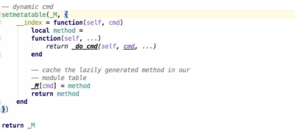而在lua里,就可以使用lua特有的特性:惰性生成动态方法,以最精简的方式cache下所有redis的命令, 并且甚至为将来redis版本可能添加的方法预留了位置:(有兴趣的同学可以看下lua元表里的__index)