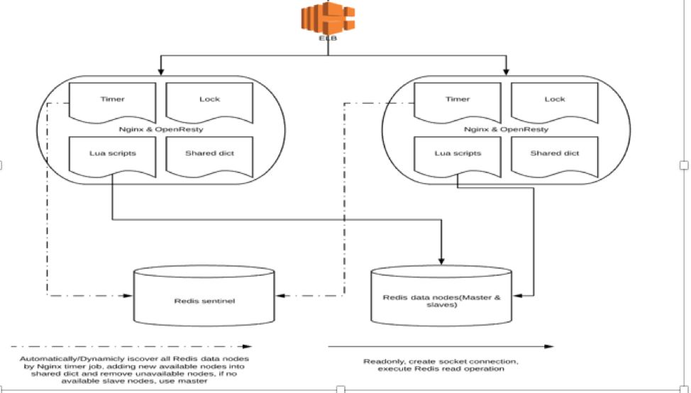 之后,team对openresty的经验积累也多了起来。我们设计了项目在AWS上的framework,以定期通过sentinel自动发现所有可用的redis节点并且存到shared dictionary里供所有openresty的process使用(ngxtimer+resty-lock+shared dictionary), 并且平稳从IDC过渡到AWS。架构图如下: