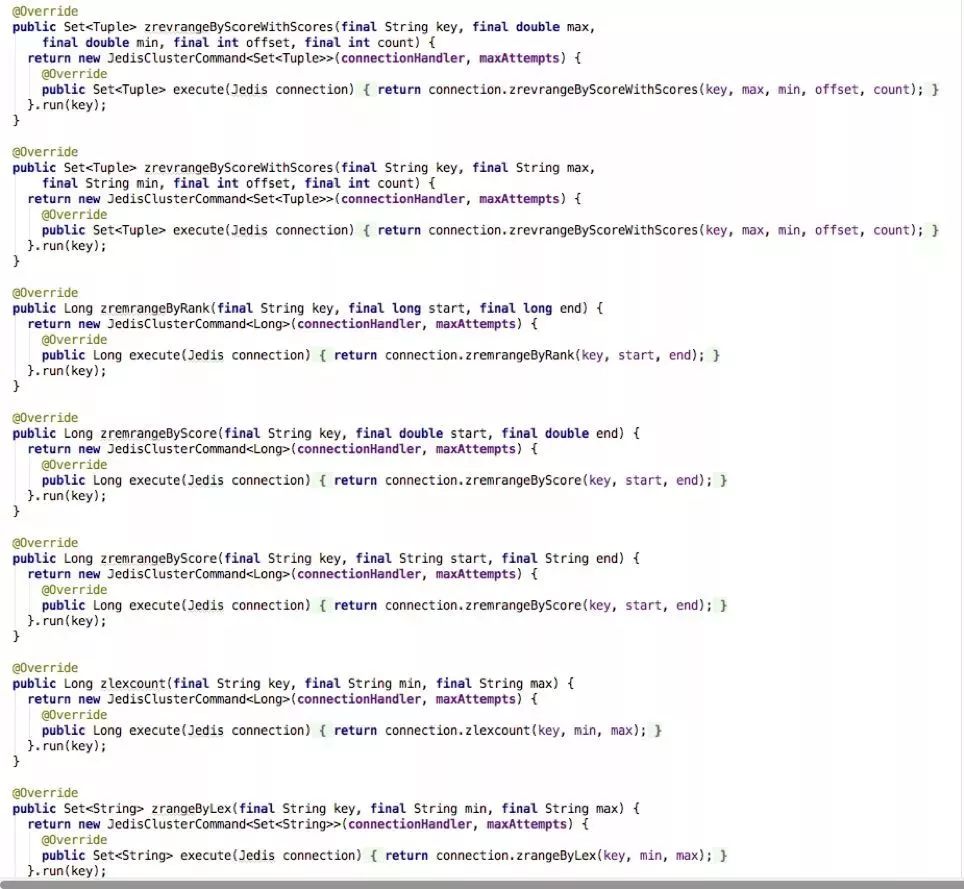 我个人并不喜欢比较每门开发语言的优劣,每个开发语言在不同场景下都有自己的优势。但是在开发resty-redis-cluster过程中,确实觉得lua作为动态语言的灵活性有时可以让代码更加精简优雅。比如Jedis为每个redis命令都定义了interface,整块代码还是给人很臃肿的感觉: