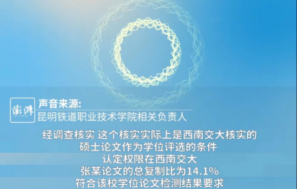 4月13日,据澎湃新闻视频报道:昆明铁道职业技术学院继续教育学院的副院长张某,被举报硕士学位论文抄袭。毕业院校西南交大正在核查此事。